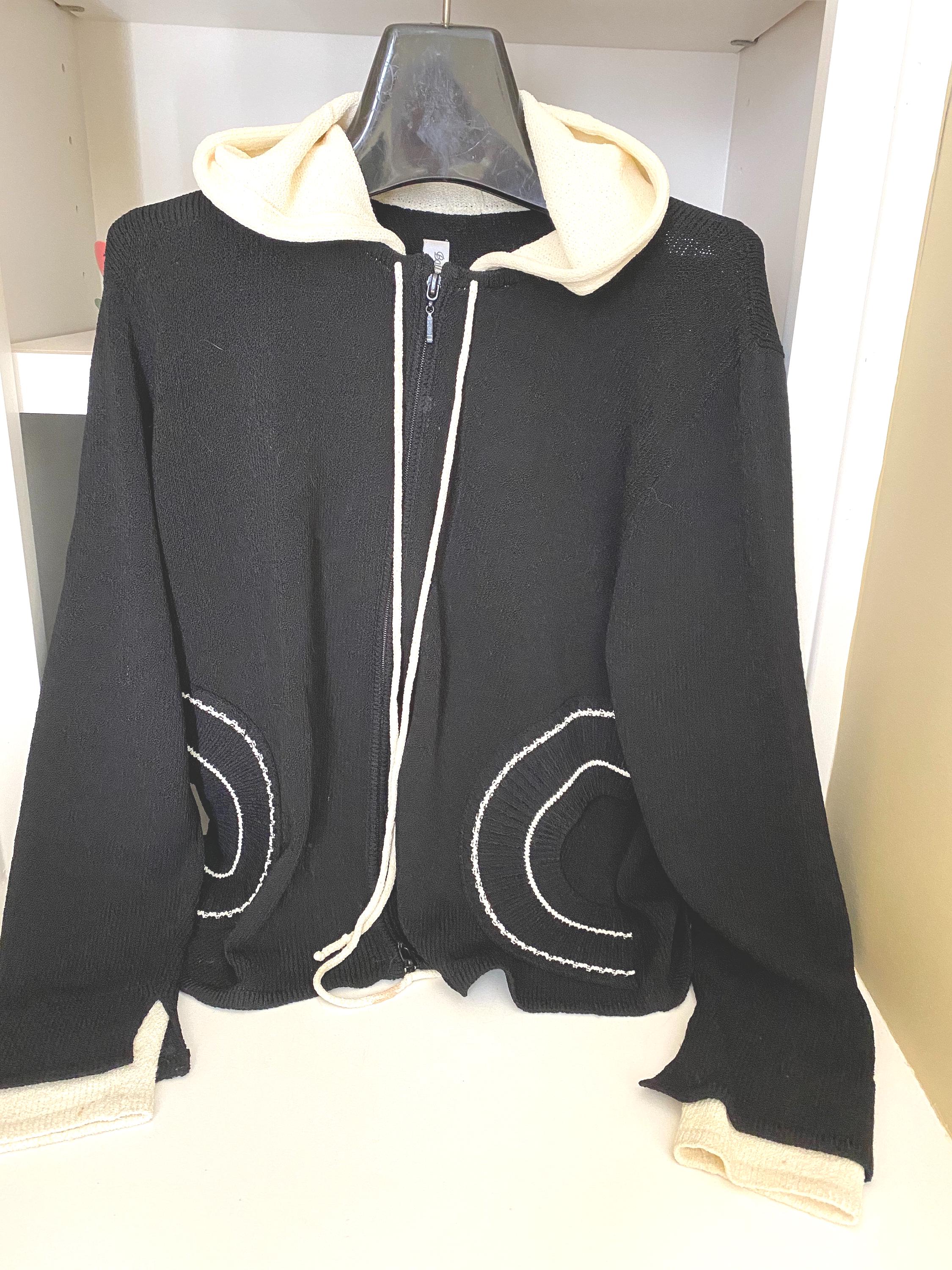 Ball of Cotton Front Zipper Cardigan Sweater in black with contrast ivory trim and hoodie that can add a touch of vintage. Two front side pockets. Perfect condition 100 percent rayon. Original Price $348 Made in USA Size L