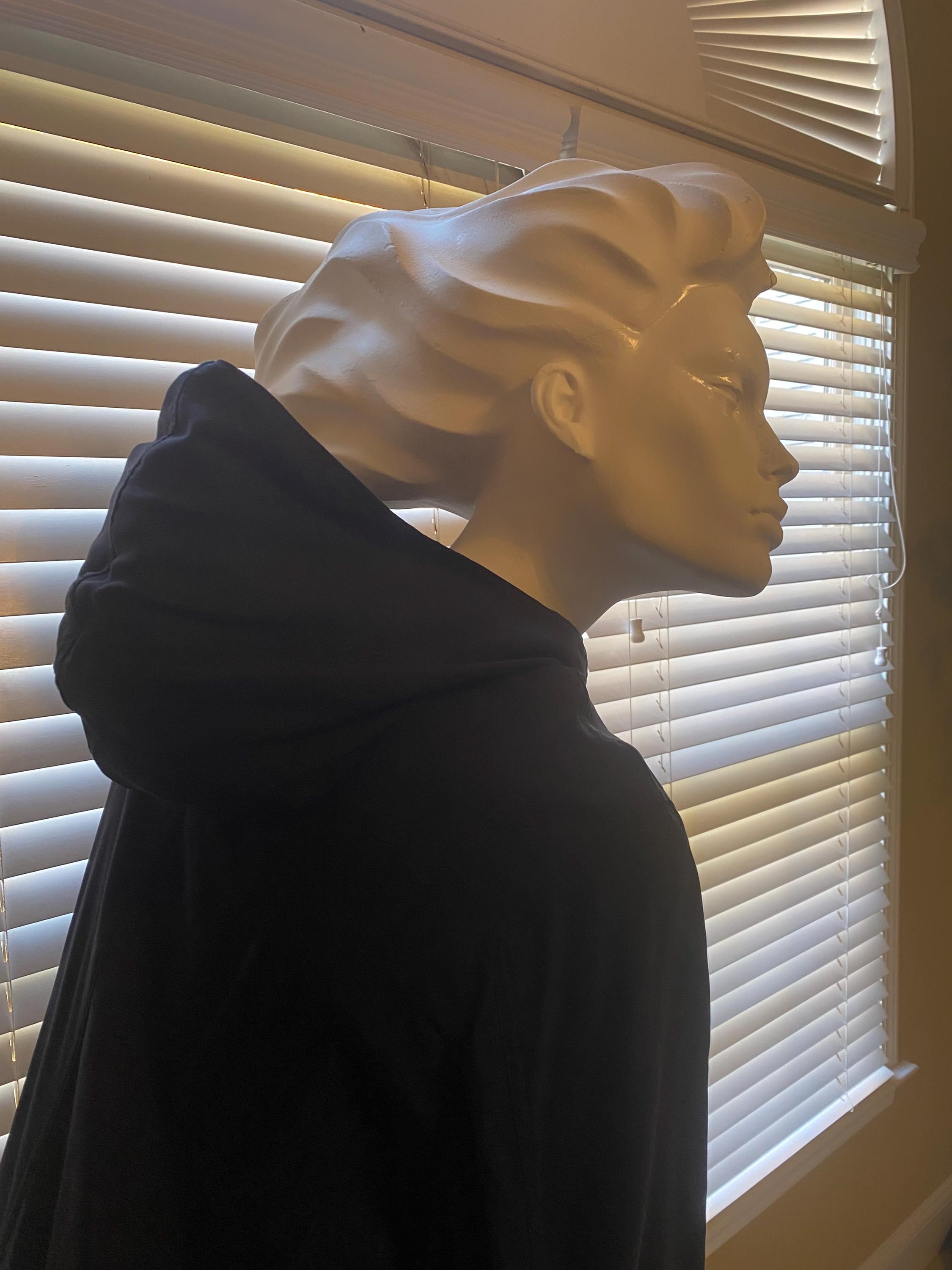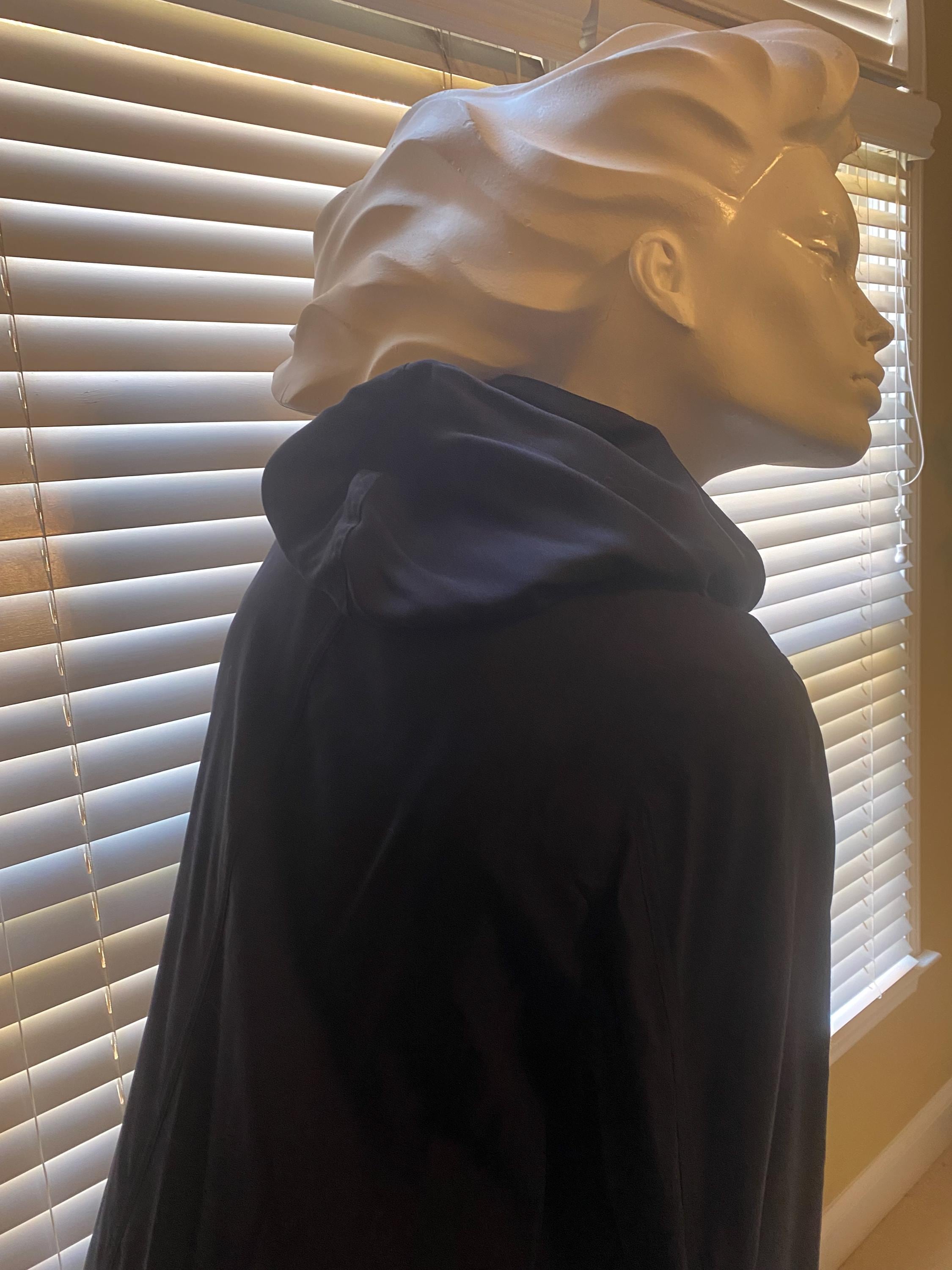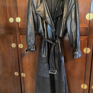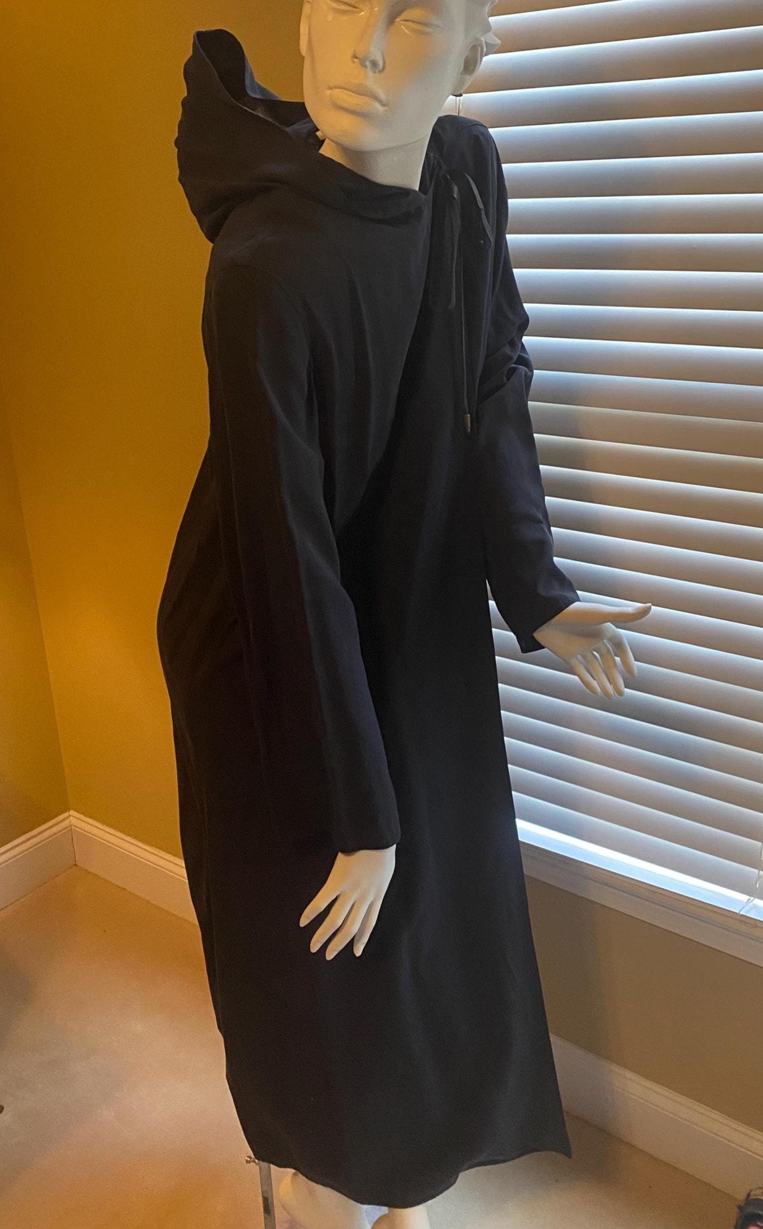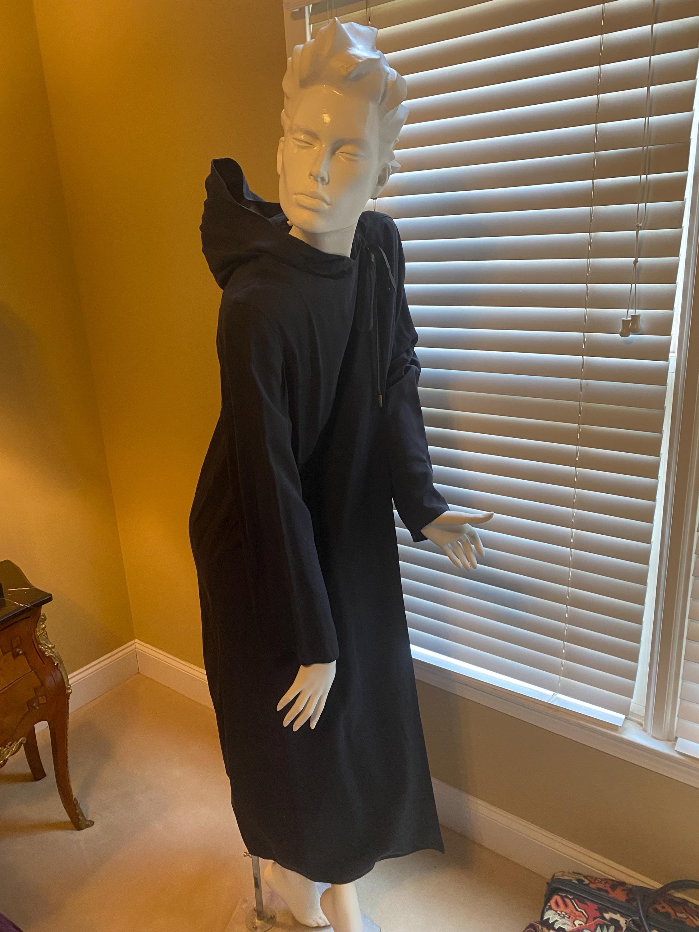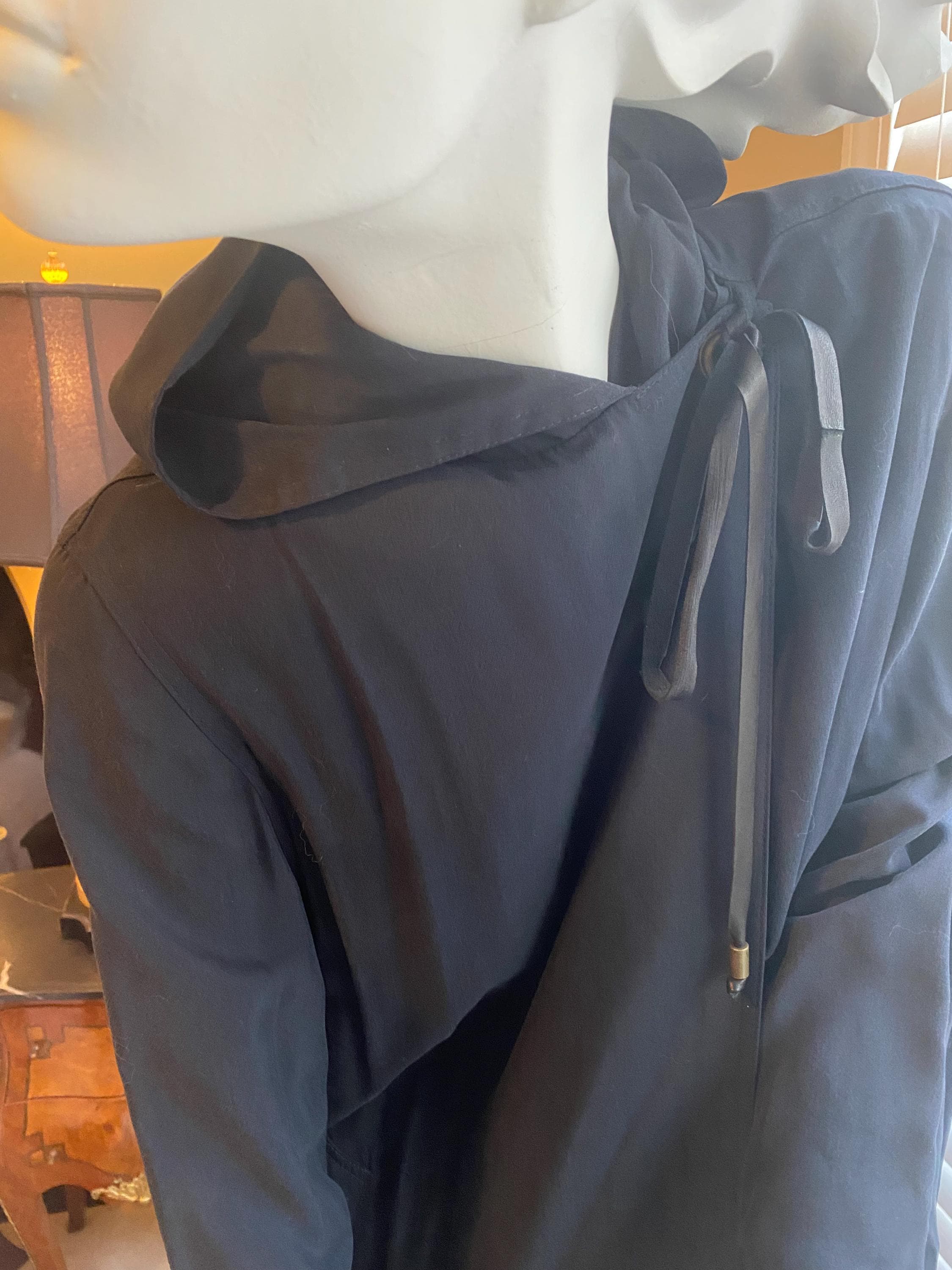 Long Ramo Sport Paris Designer Rain Coat in Navy Blue - made in Canada. Size L inside button closure with Neck Tie Bow Closure. Light Weight Fabric - Lyocell blend, beautiful hand, unique tie closure. The coat offers the perfect example of everyday luxury meeting superior functionality with a stylish silhouette that remains timeless.