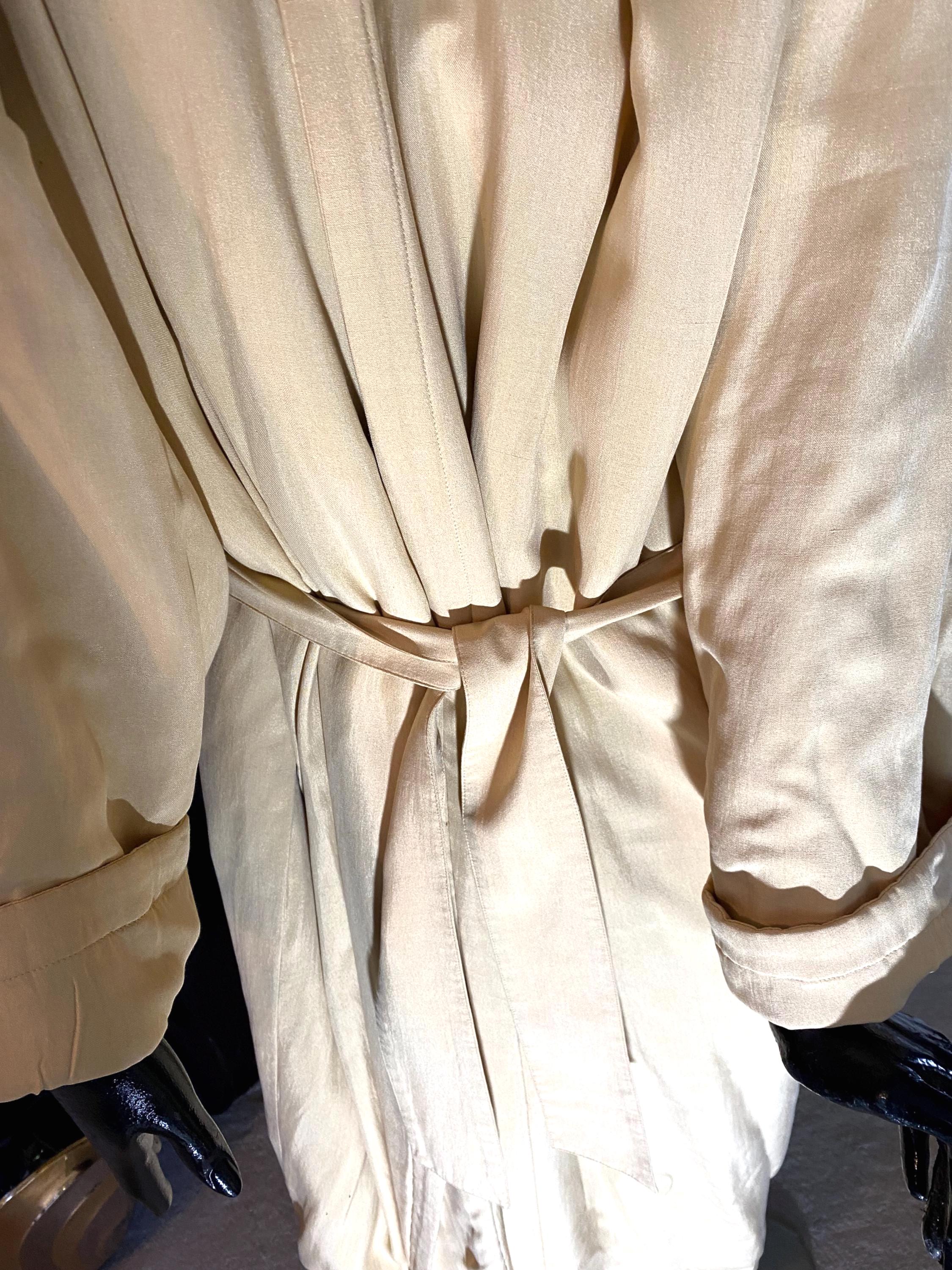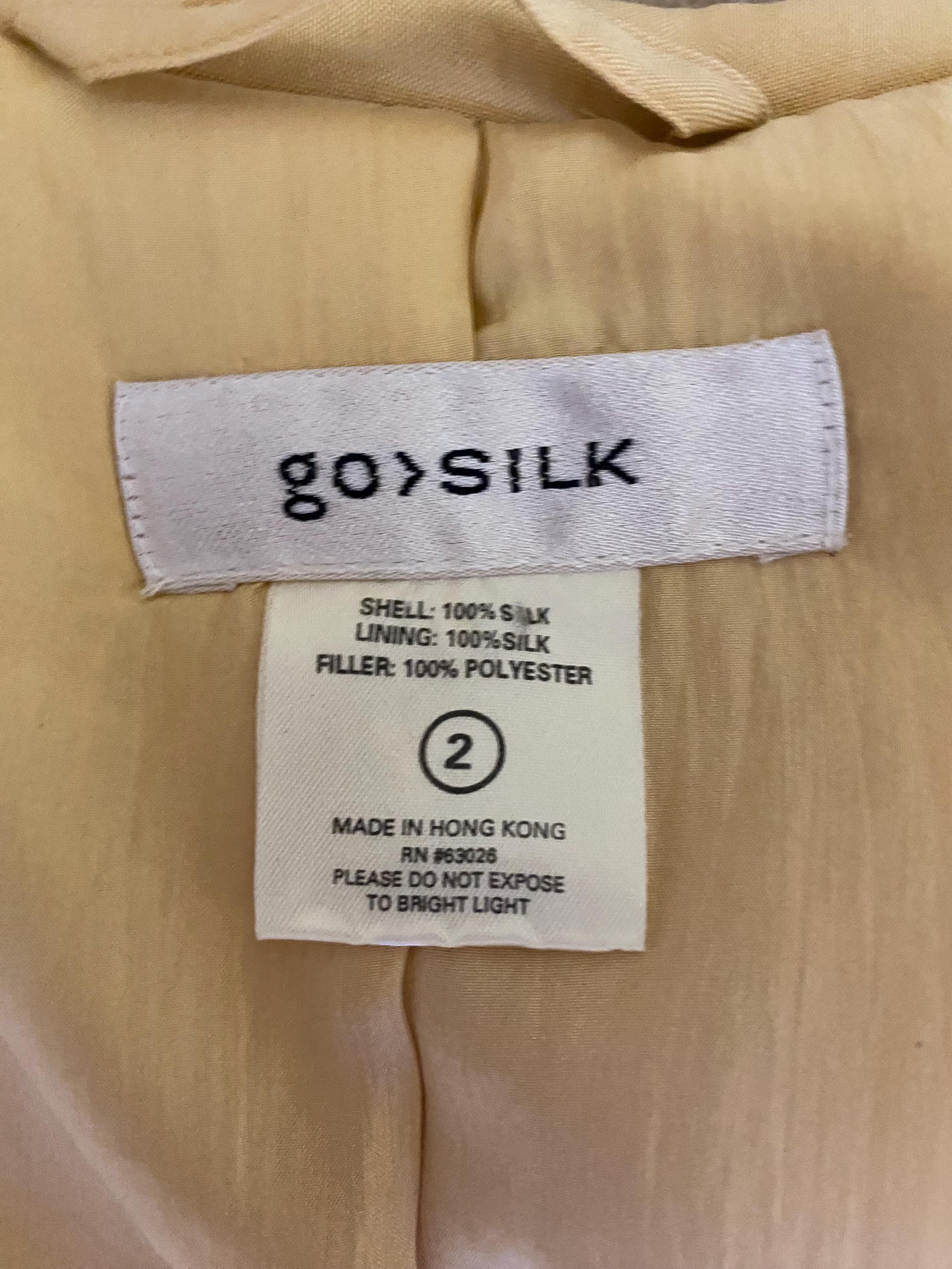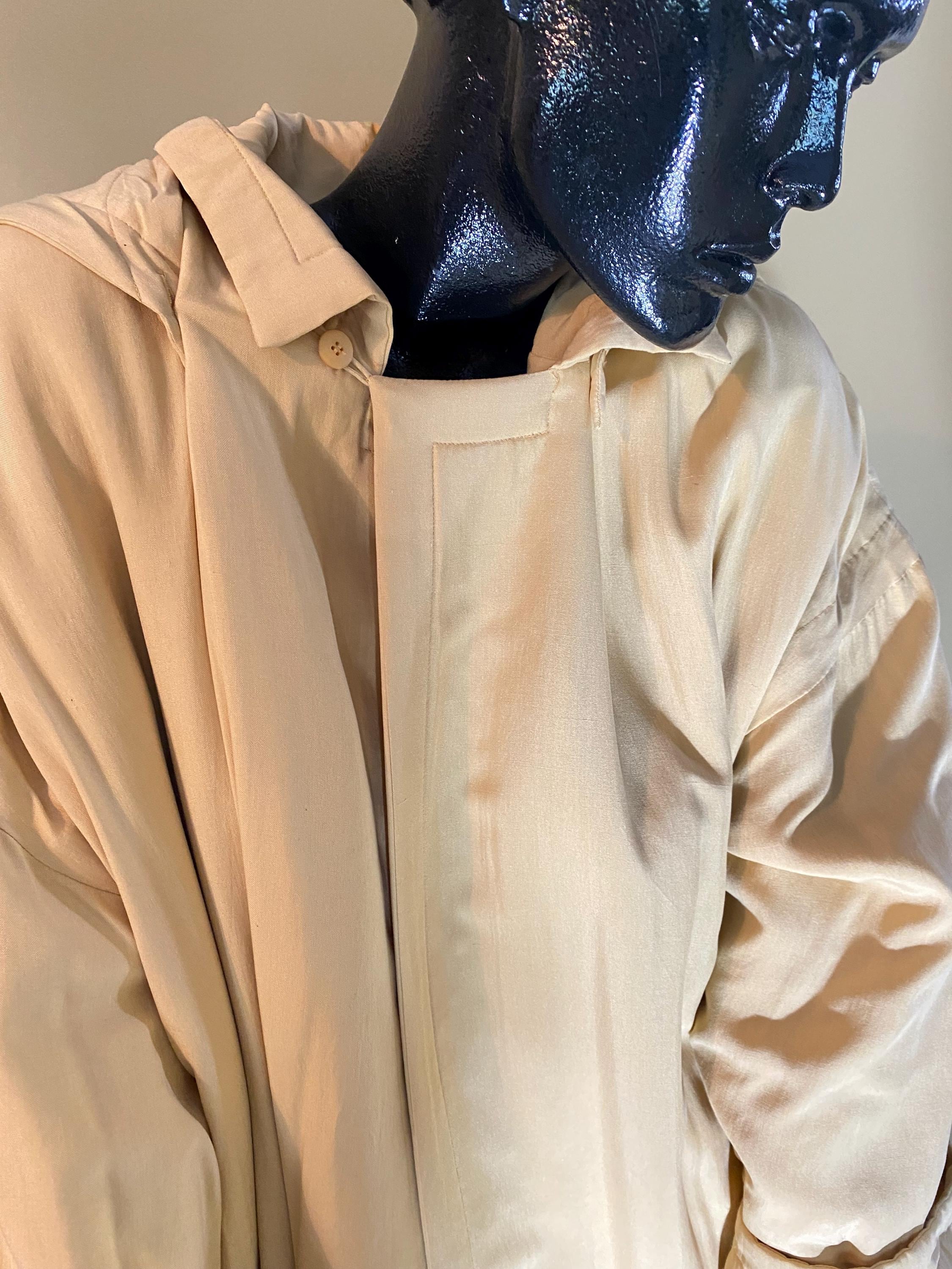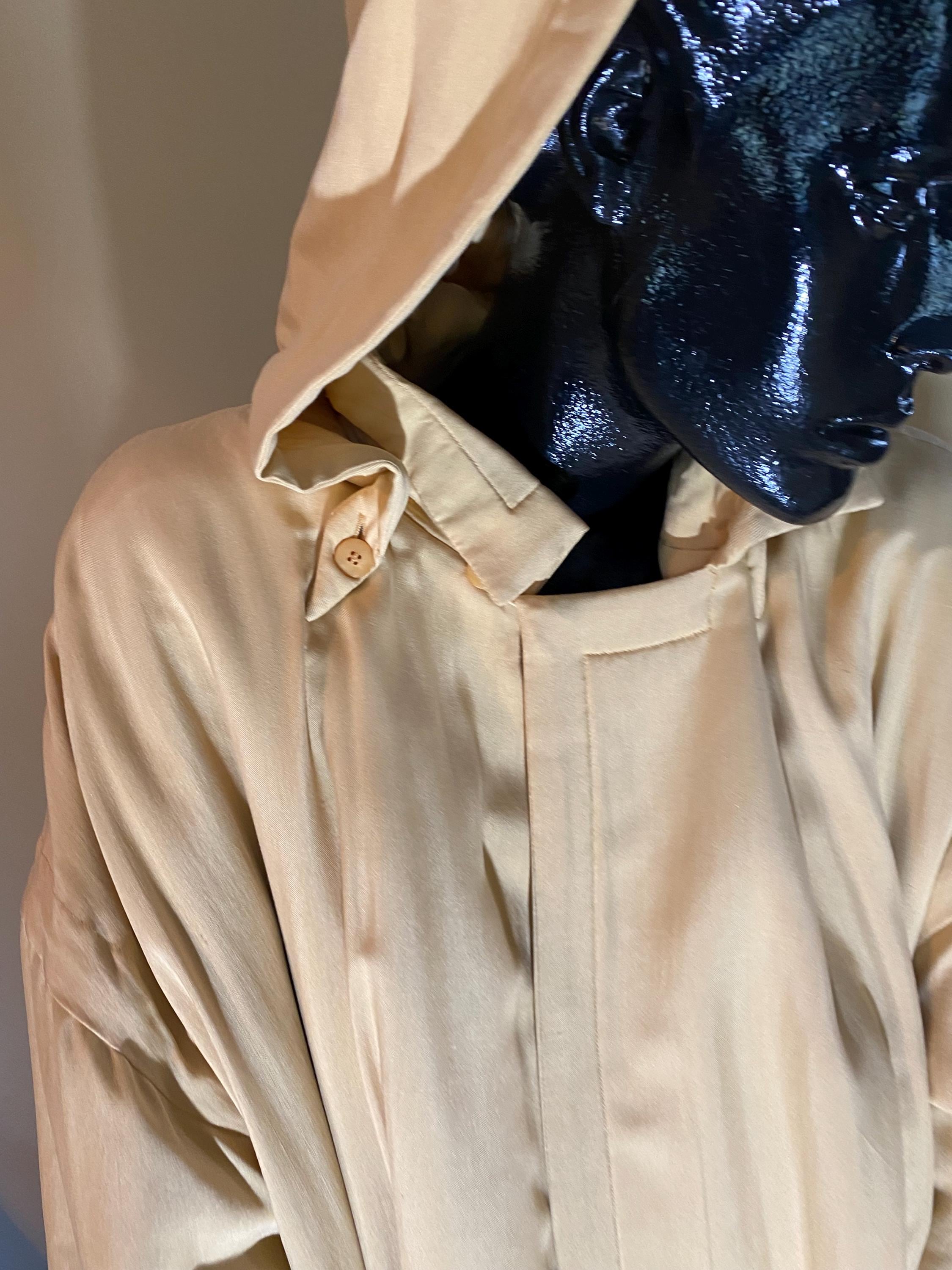Go Silk Long Coat in beautiful cream with hood, matching belt and button front. Size 2 (Fit 10-12) 100 percent silk with filler 100 percent polyester. Machine washable - tumble dry. Pristine condition, brand new - Never worn.