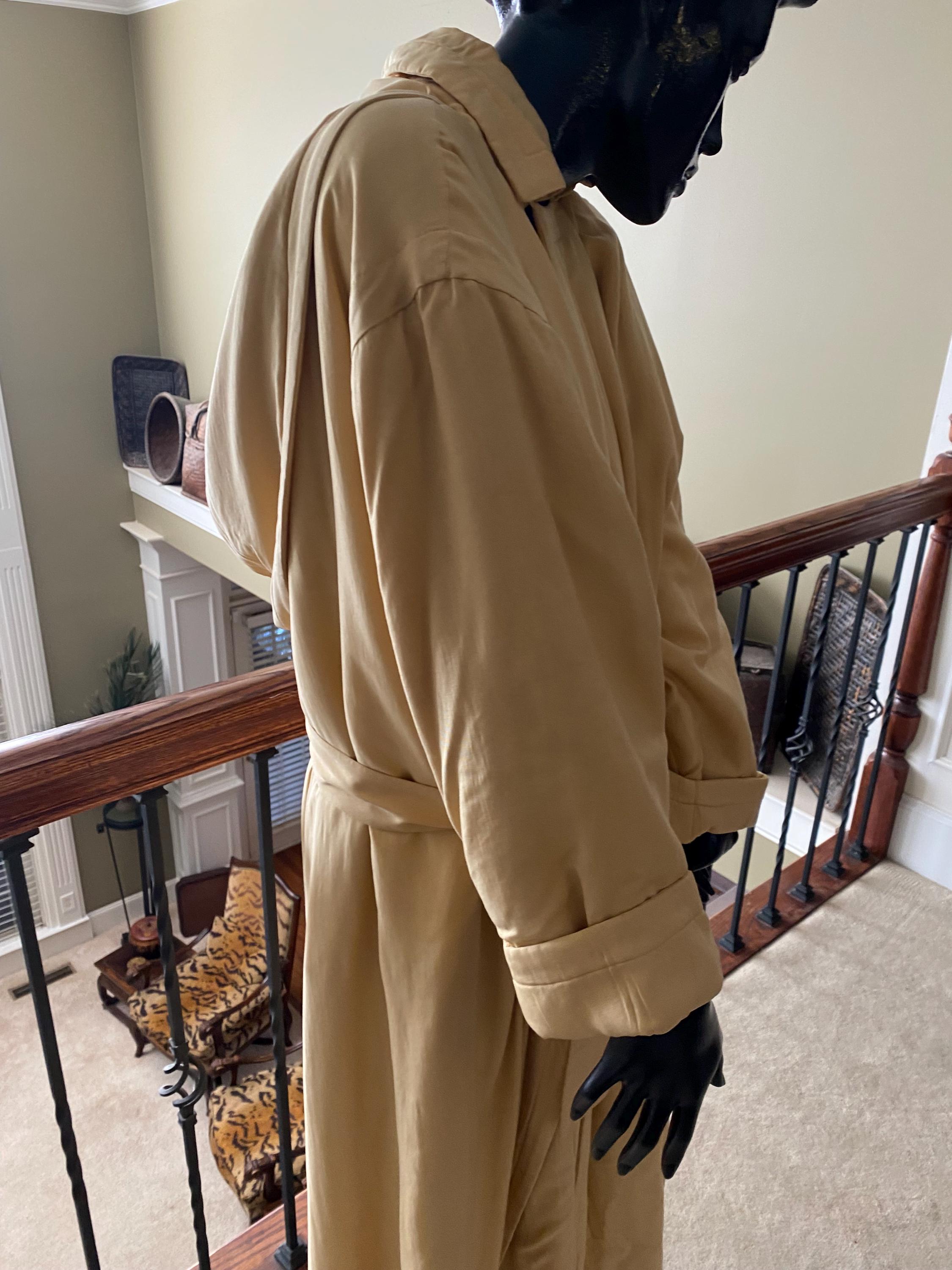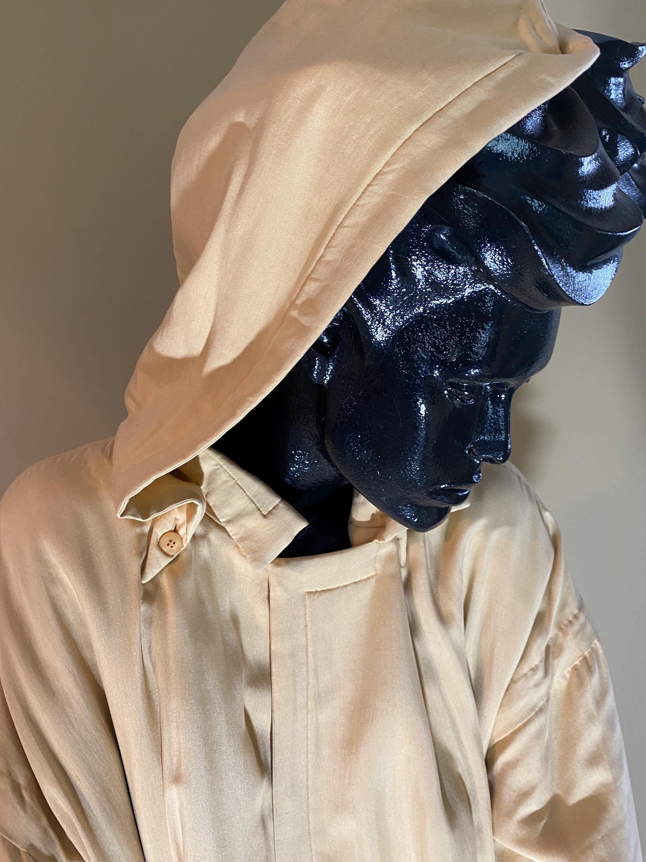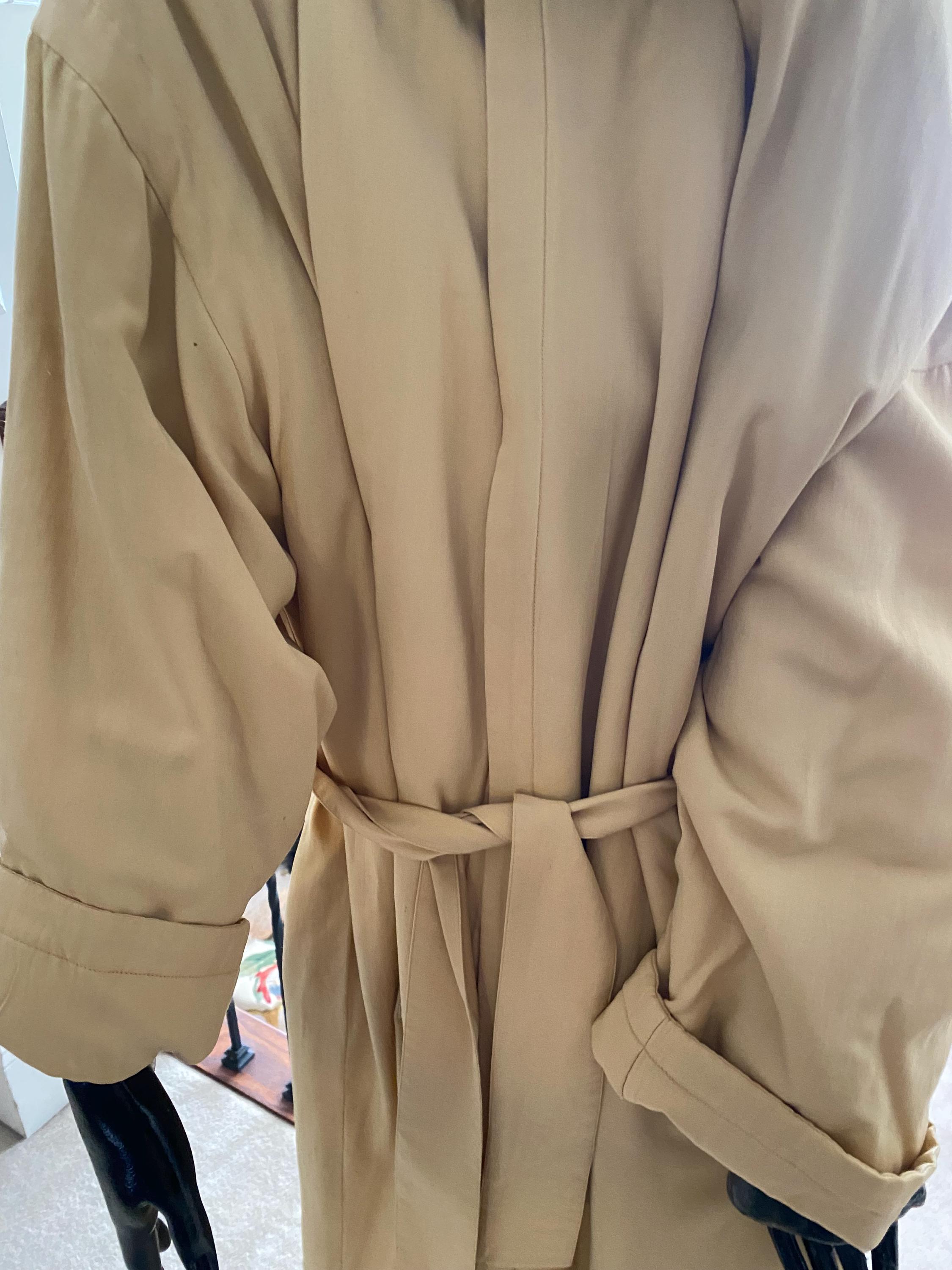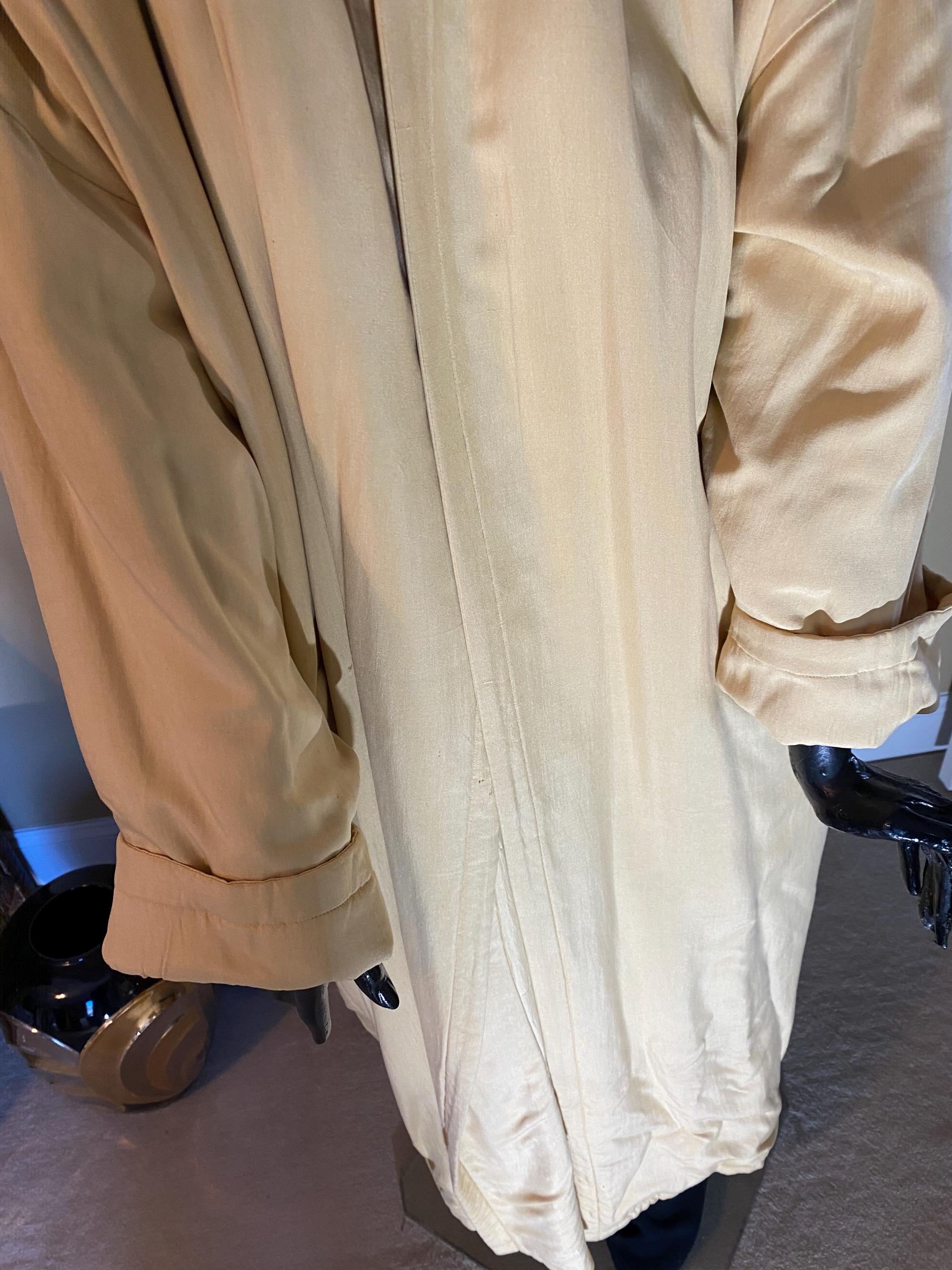 Go Silk Long Coat in beautiful cream with hood, matching belt and button front. Size 2 (Fit 10-12) 100 percent silk with filler 100 percent polyester. Machine washable - tumble dry. Pristine condition, brand new - Never worn.