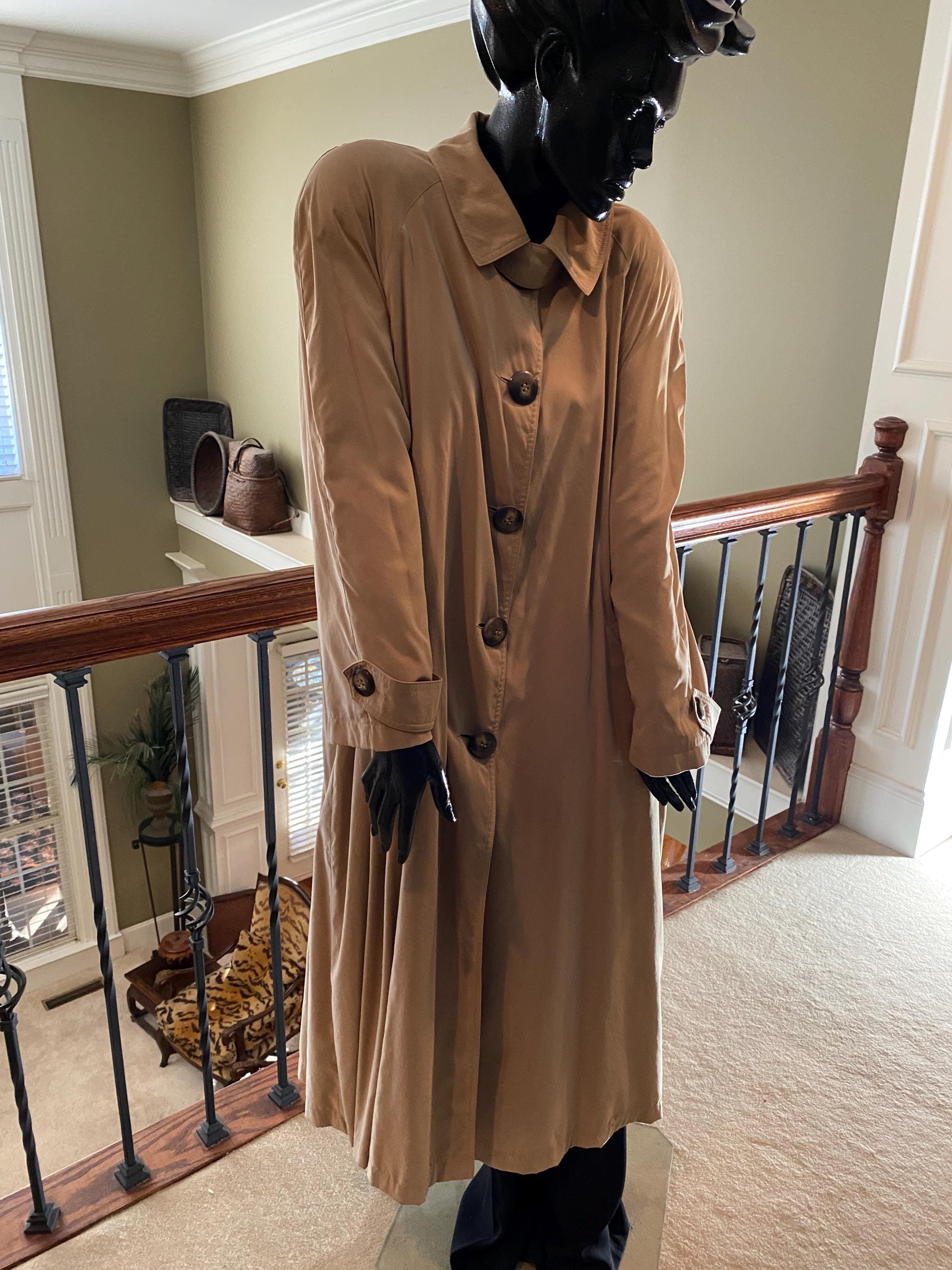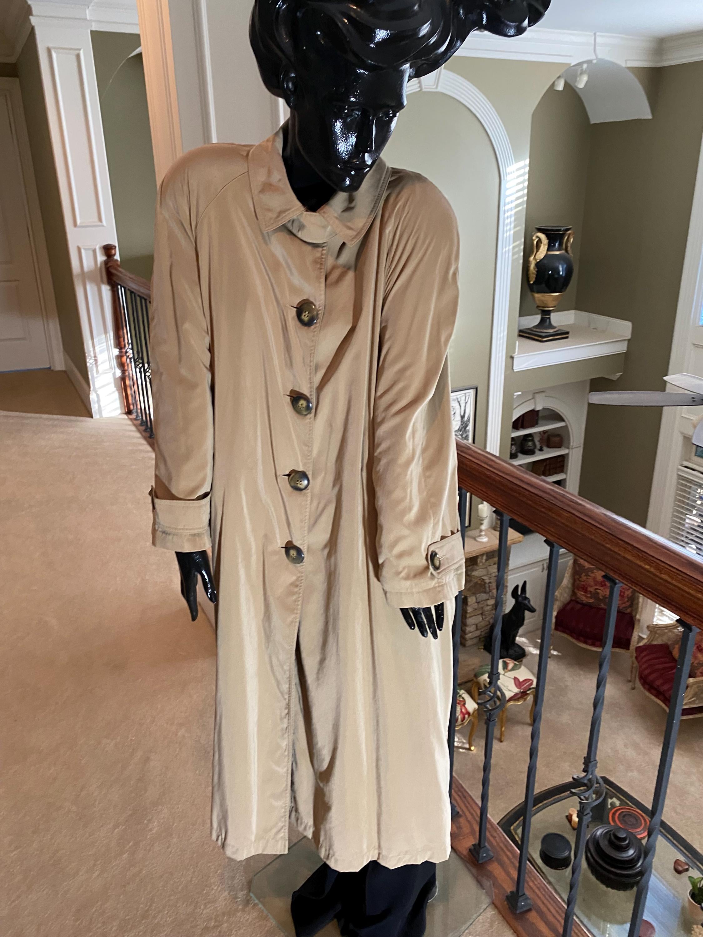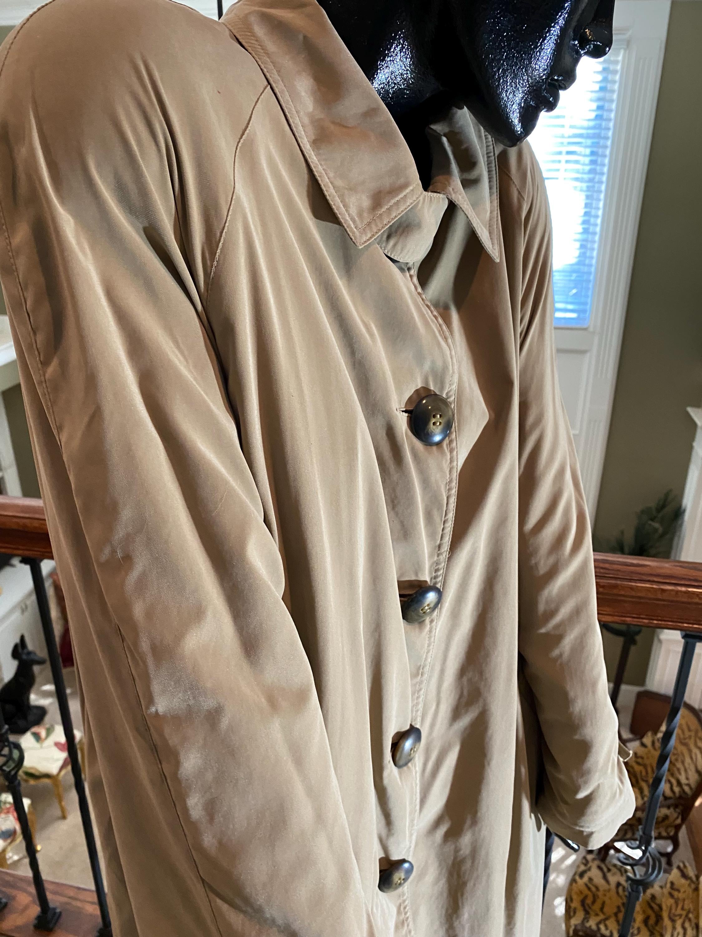 Canadian Designer, Erving Samuel, single breasted micro fiber long trench coat in Khaki color. Montreal designer, original micro-fiber with 2 slanted side pockets. Tab Detail on Sleave - Dry Clean only. Size M (large) Interesting Collar detail. Never worn. Embrace the unique vintage charm of a true classic.