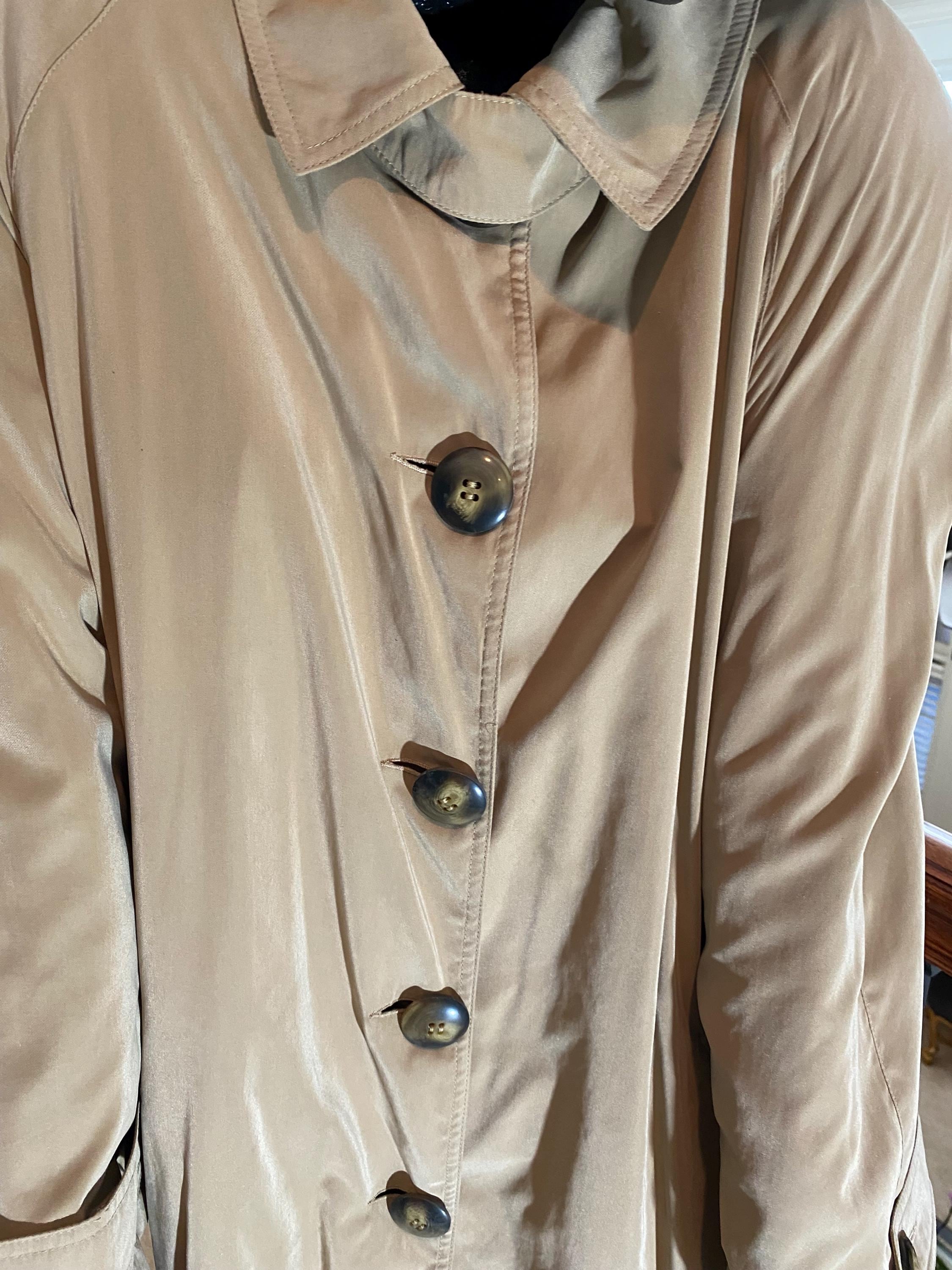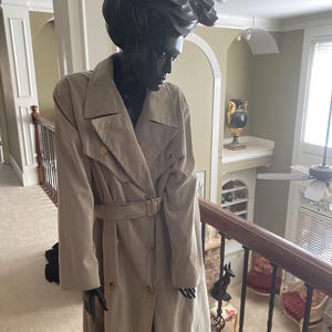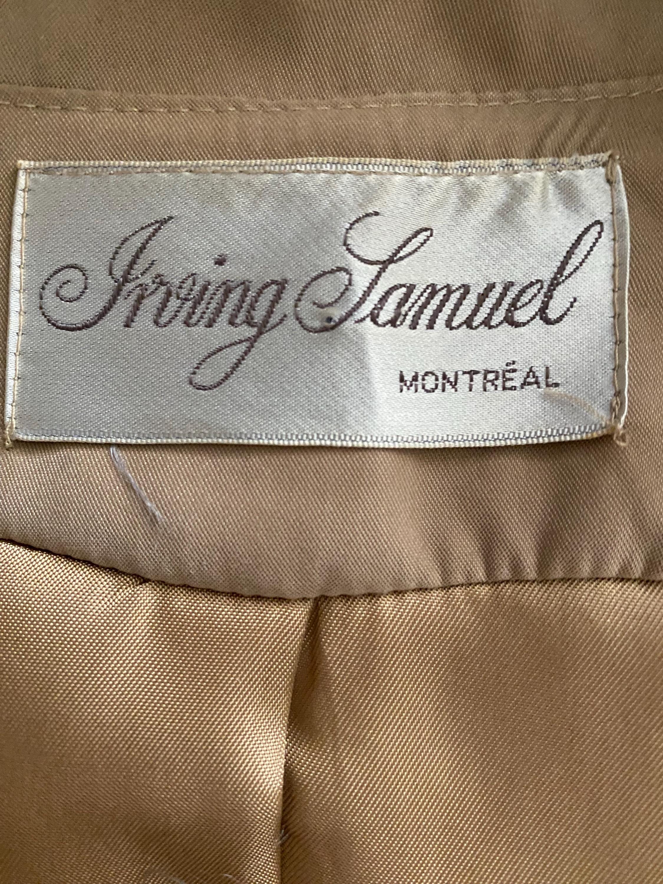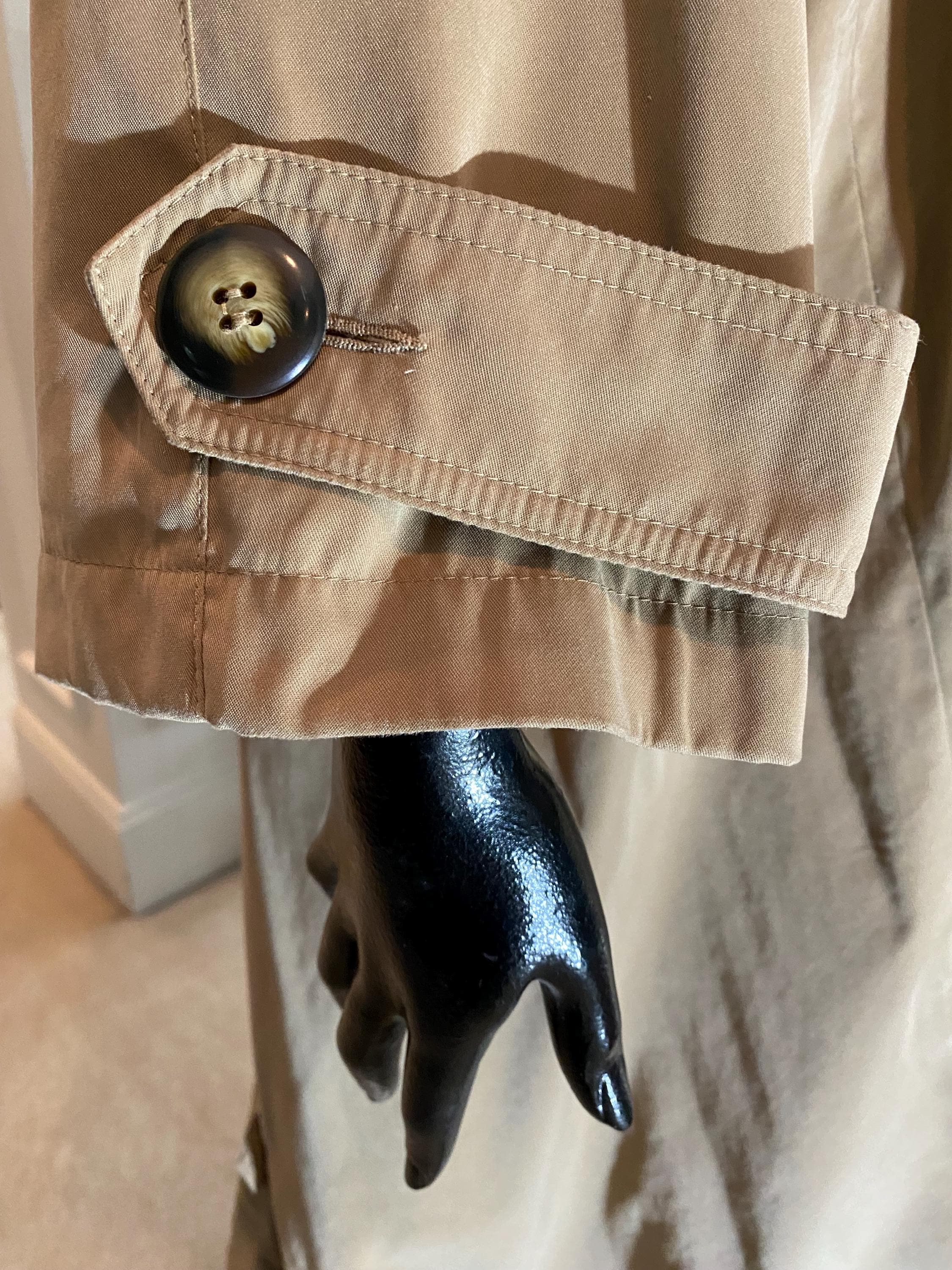 Canadian Designer, Erving Samuel, single breasted micro fiber long trench coat in Khaki color. Montreal designer, original micro-fiber with 2 slanted side pockets. Tab Detail on Sleave - Dry Clean only. Size M (large) Interesting Collar detail. Never worn. Embrace the unique vintage charm of a true classic.