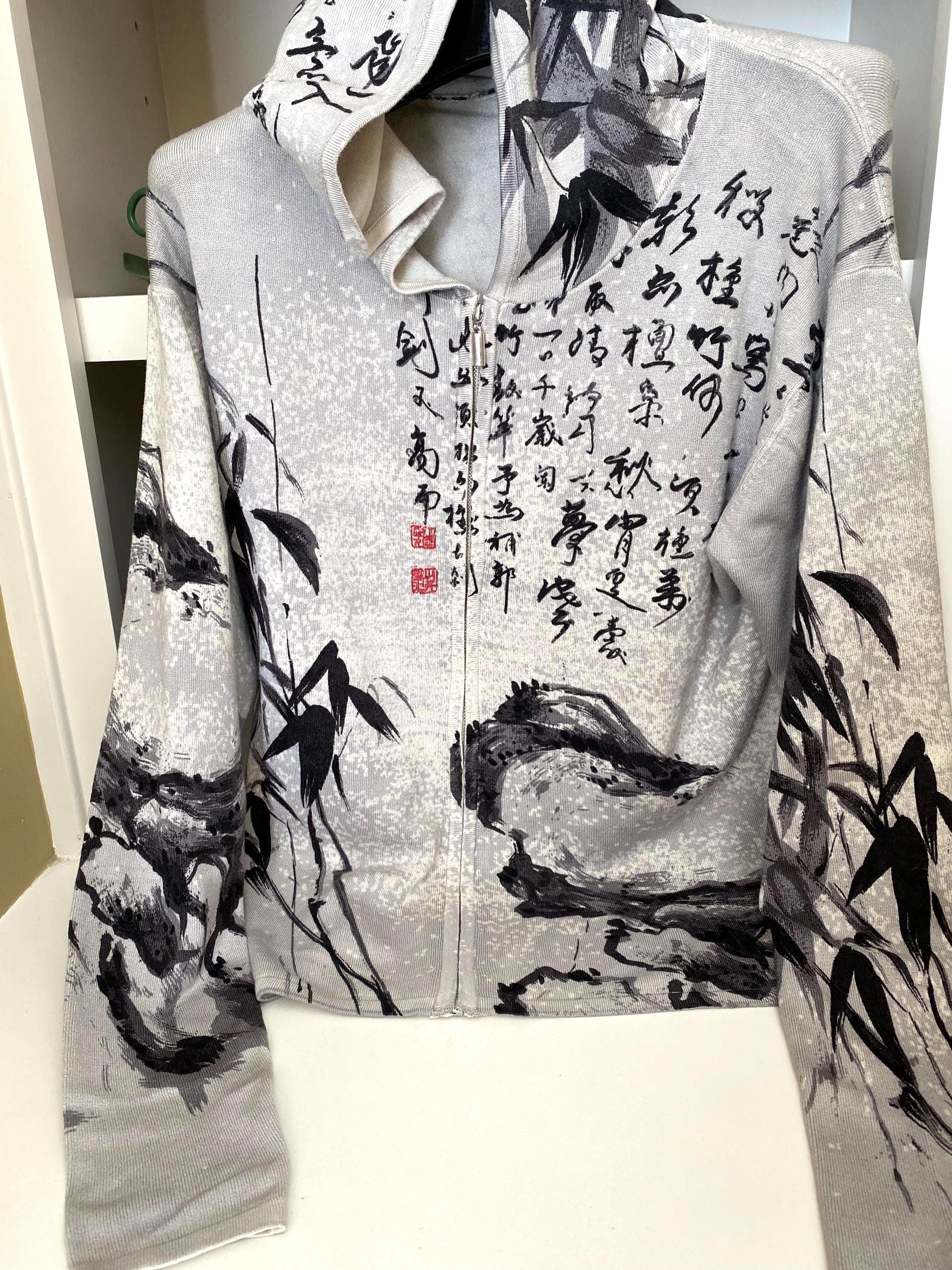 Very distinctive hooded zipper jacket by designer Mark Richards gray oriental print with hood. Never worn - perfect condition, long sleave in size L.