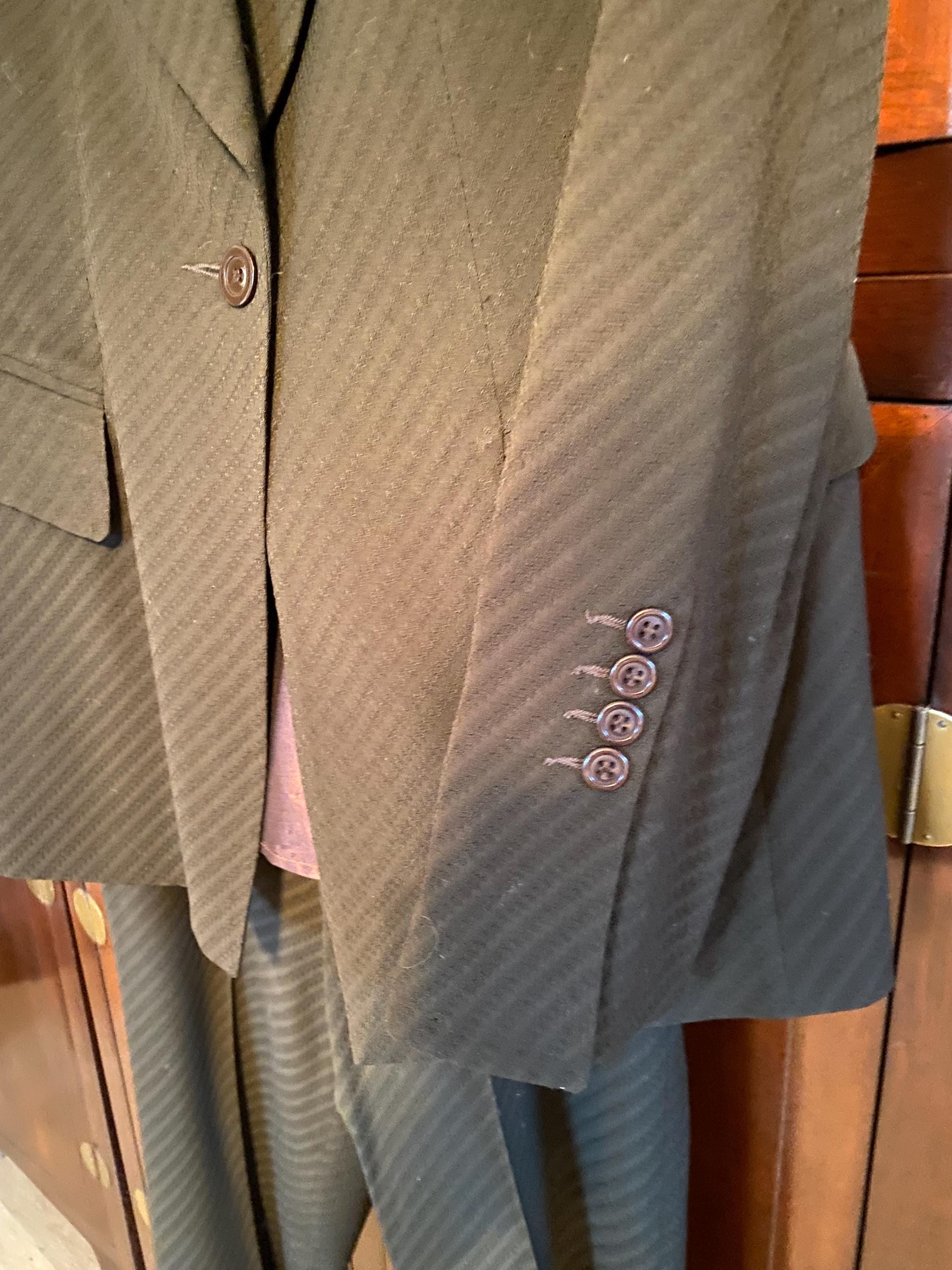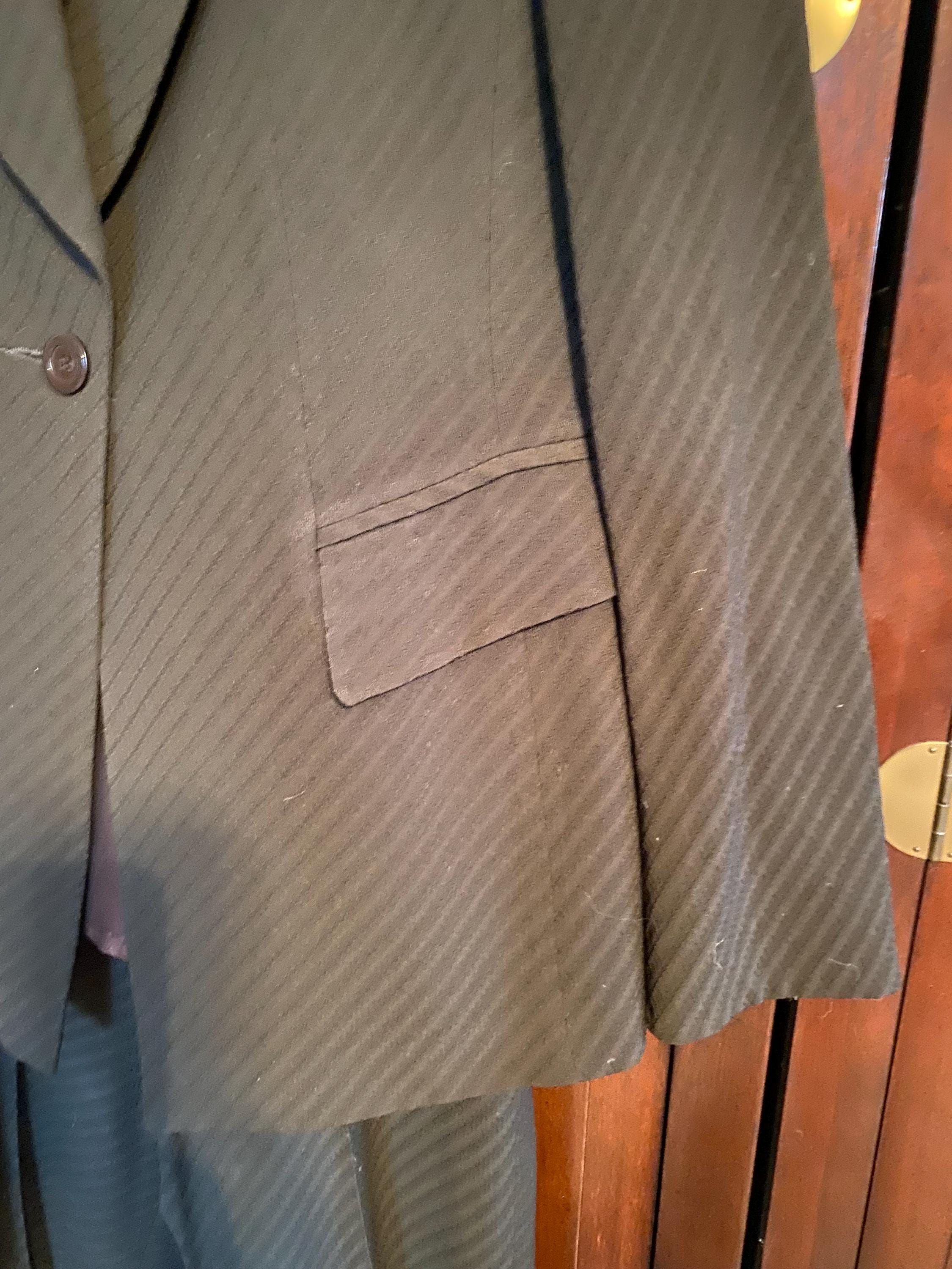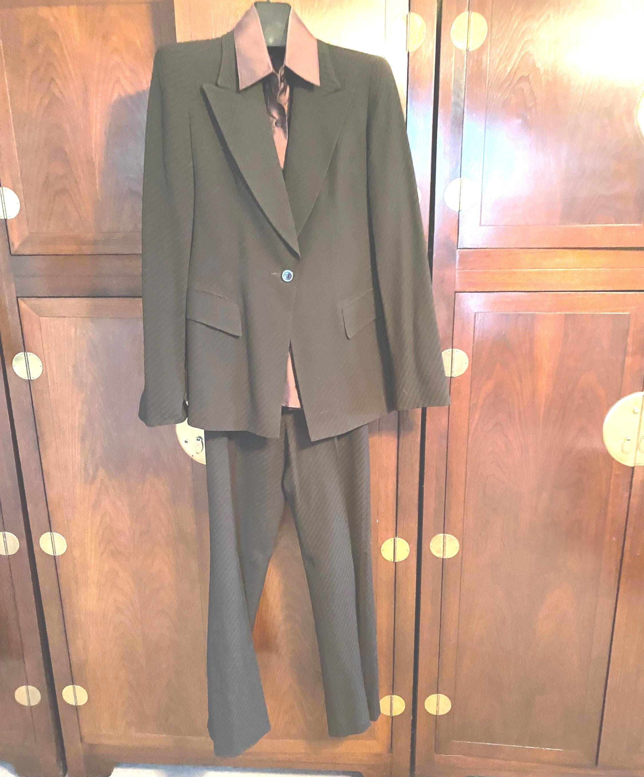 Canadian Designer Marisa Minicucci 2 piece jacket size 10 and pant size 8 in brown and diagonal grey stripe for the professional women who want sophisticated high-end clothing. Marisa is known for using high quality fabrics appealing to clientele seeking classic pieces