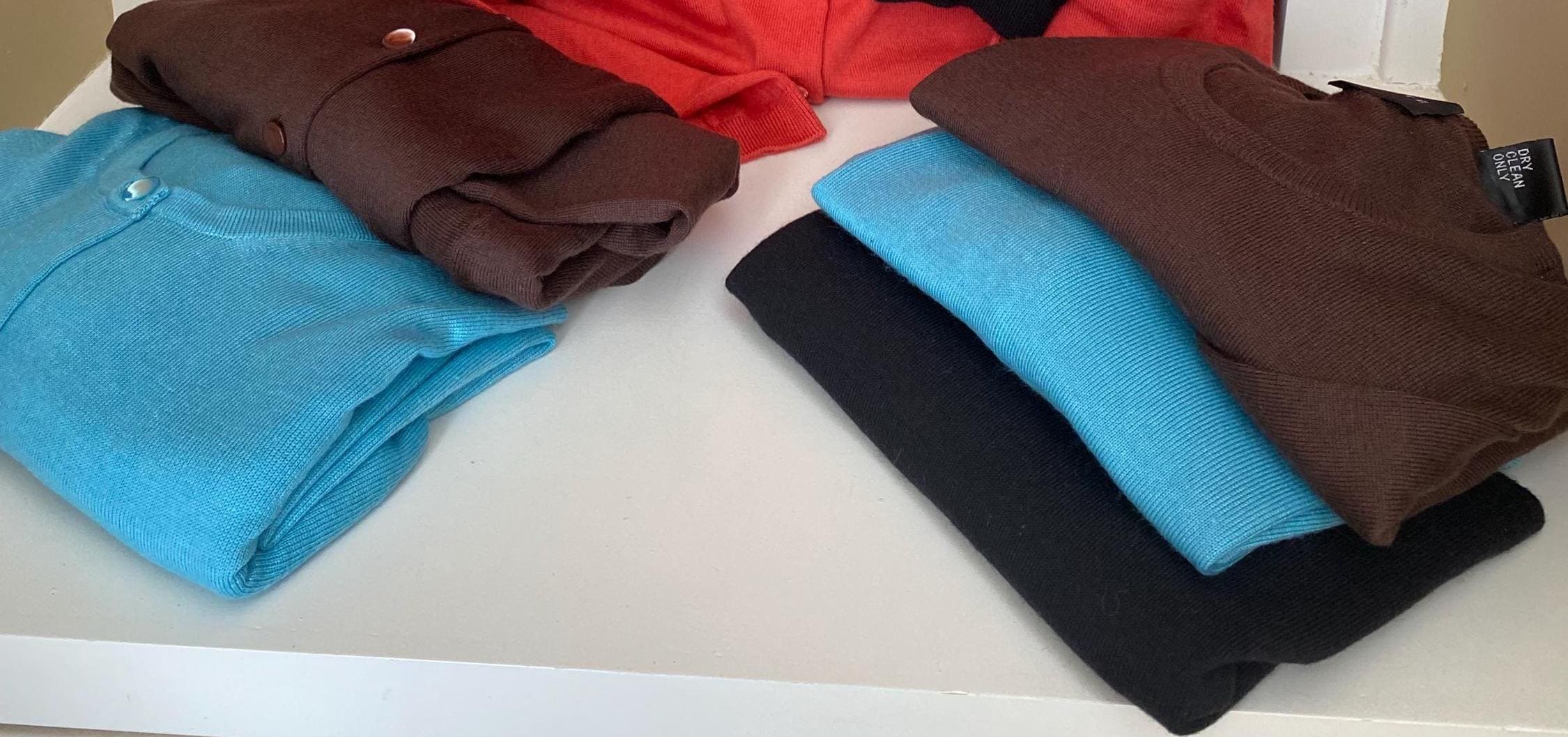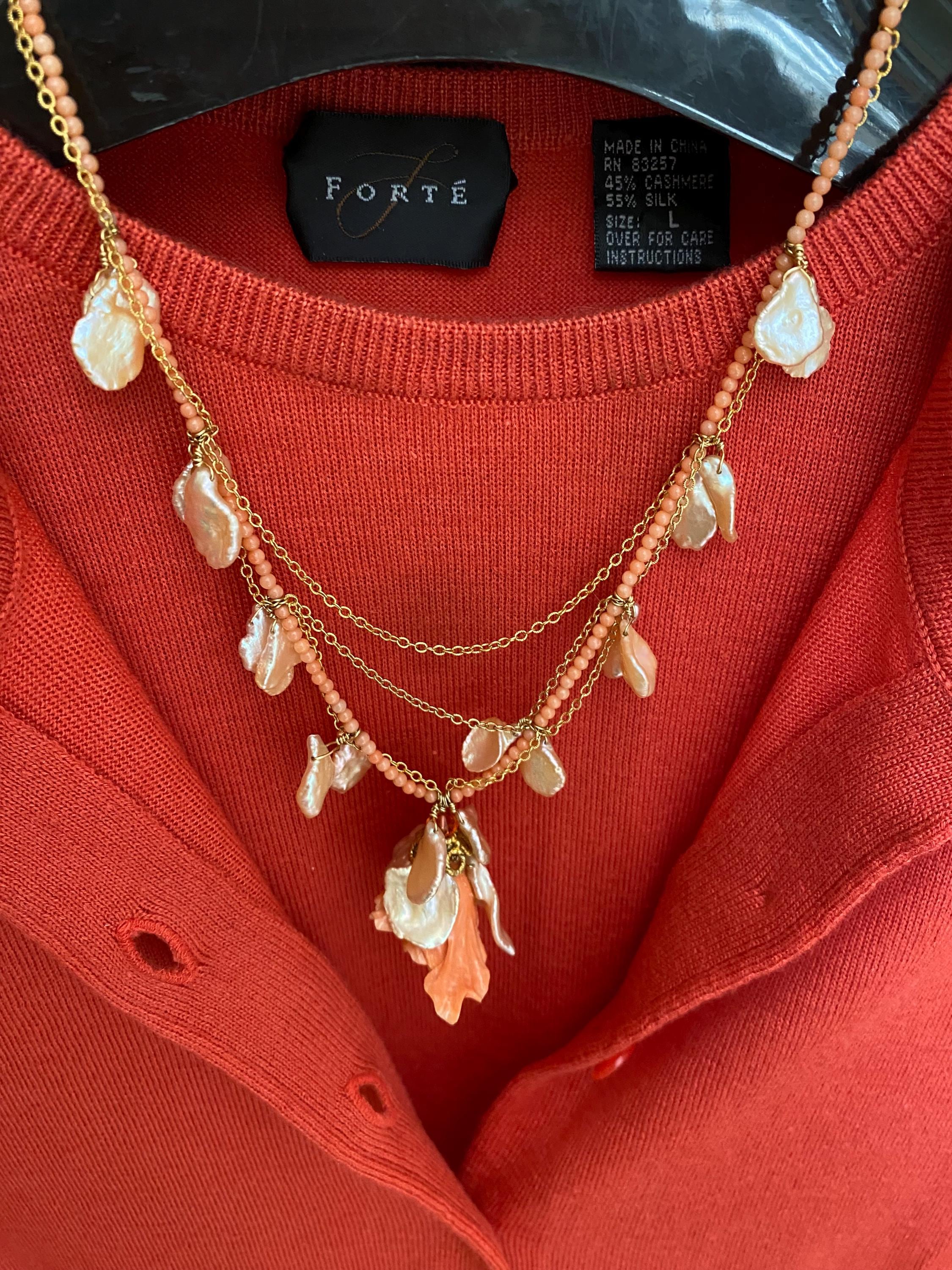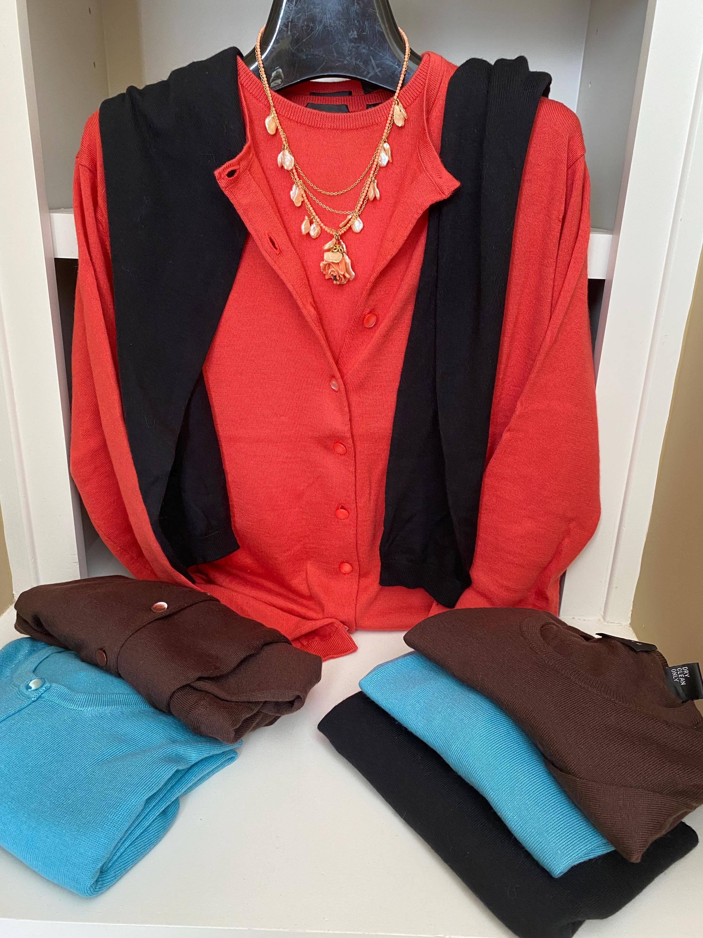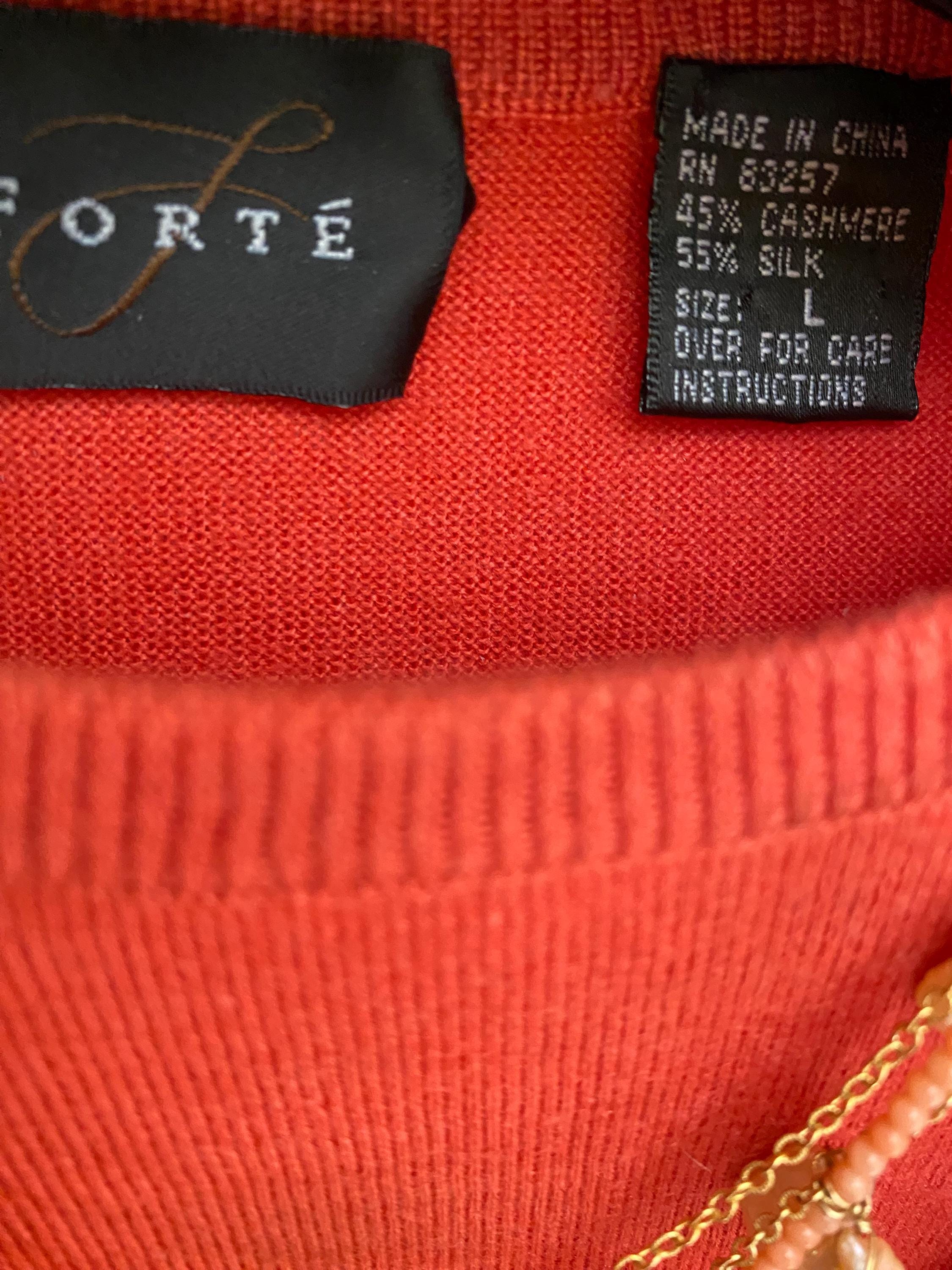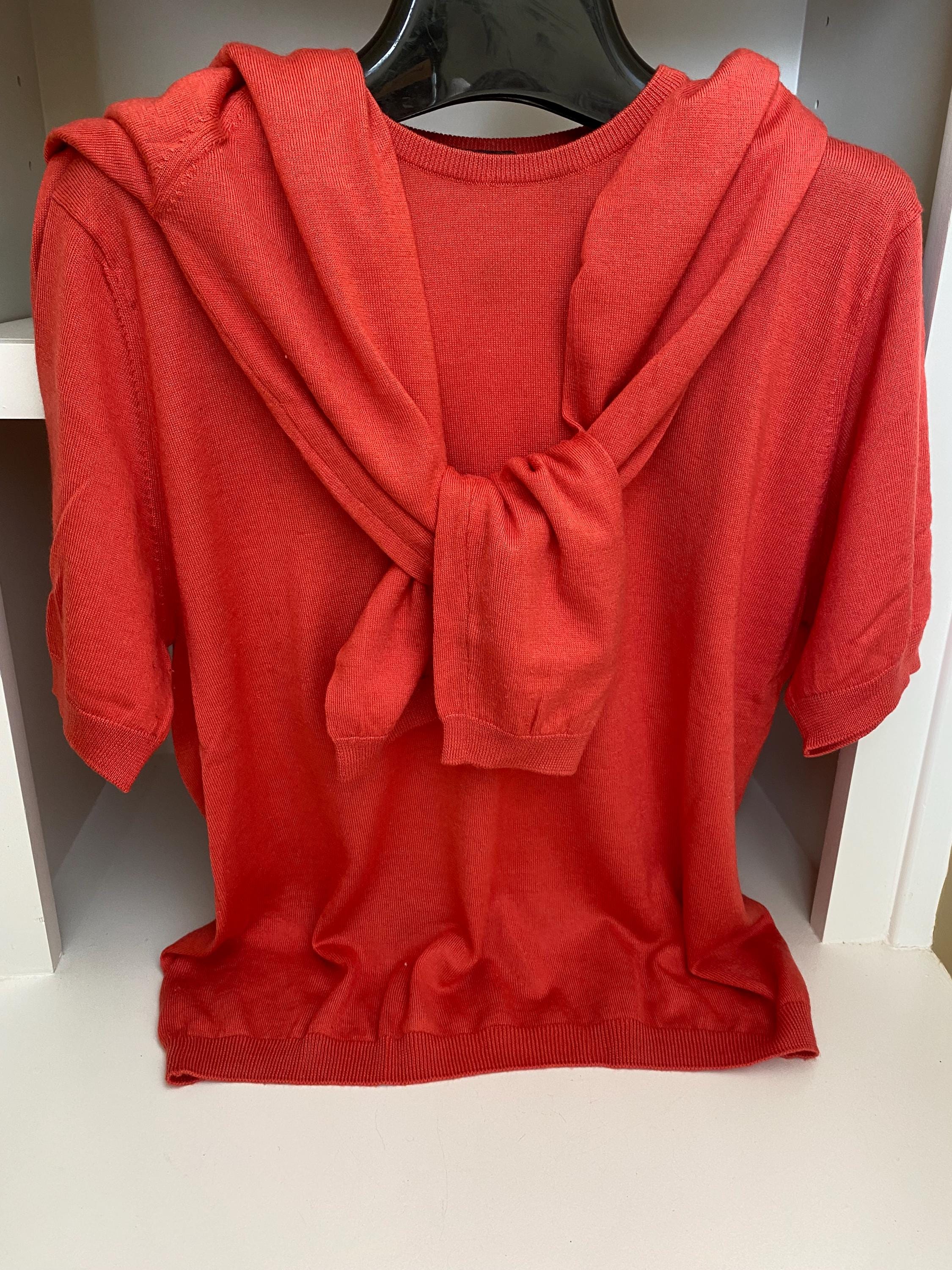 Designer Forte Silk & Cashmere Cardigan Twinset in 4 colors. Features short sleave crewneck with 8 buttons and banded hem in coral, turquoise, black, and chocolate brown Note: Necklace not included. 45% Cashmere 55% silk Never worn