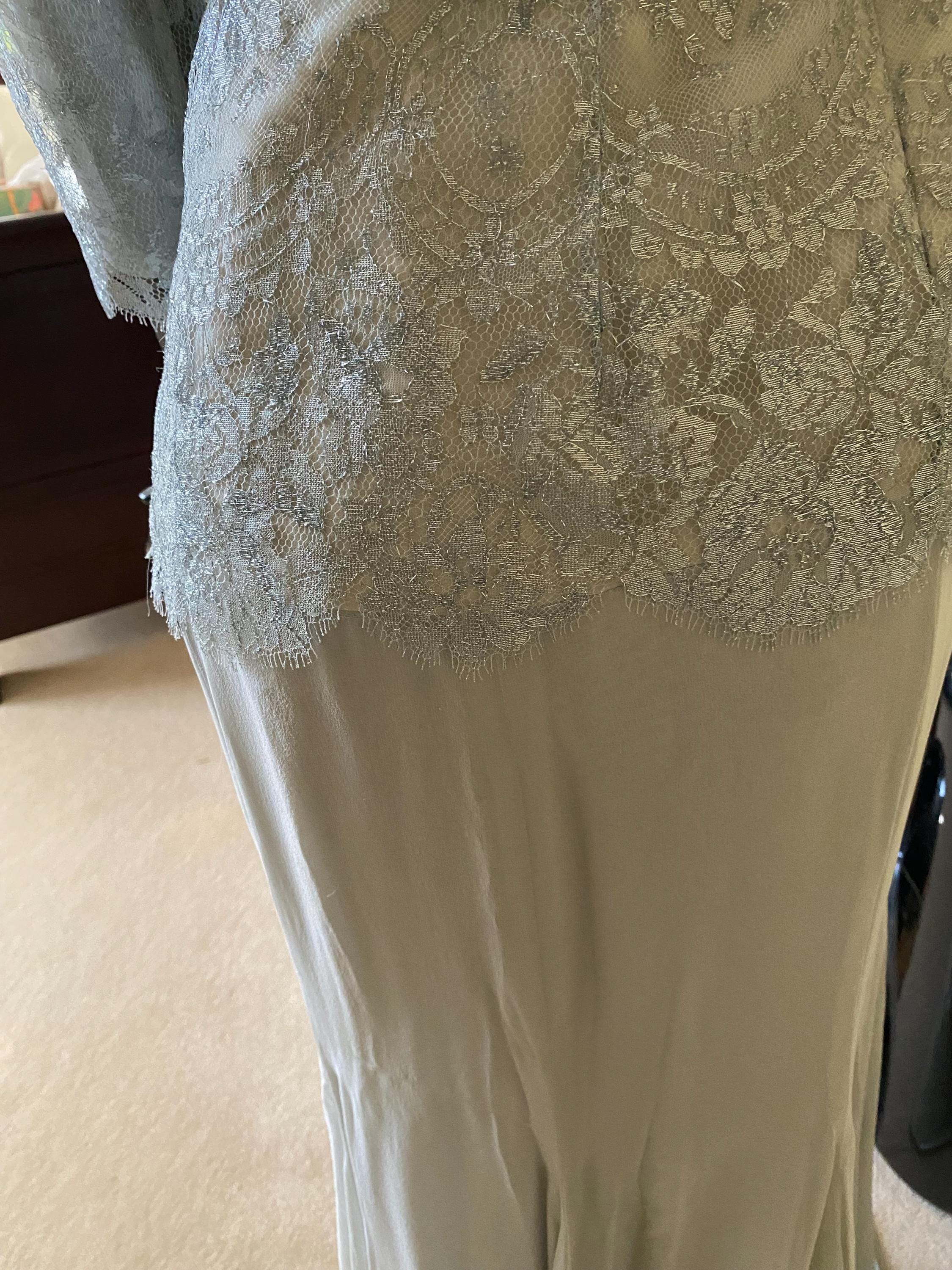 Designer Sansappele lace and chiffon robins egg light blue, long gown 3/4 length sleeve with overlay lace bodice with chiffon godet silk skirt. Size 8, never worn - perfect condition